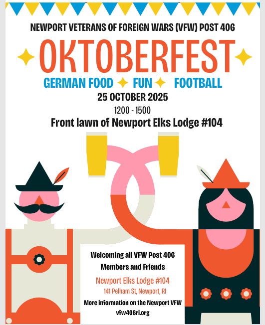 VFW Post 406 is holding an Oktoberfest themed cookout and all members, families, friends, supporters and prospective members are invited to join us. It will be held on October 25 from 1200-1500 on the front lawn of the Newport Elks lodge. Celebrate with us as we enjoy the camaraderie of our post members with German food, fun, football and games. An email will be sent for post members to RSVP with the number of guests attending.